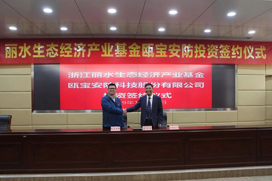 2019年11月23日下午,浙江麗水生態經濟產業基金——甌寶安防科技股份有限公司簽字儀式隆重開幕。浙江麗水生態經濟產業基金有限公司董事長兼總經理陳磊、副總經理黃麗莉、甌寶公司董事長陳曉建、常務副總張潔信參加簽字儀式。這次簽約意味著甌寶得到了麗水政府產業基金三千萬元的對外投資,是該基金在蓮都區投資的第一家民企,可以獲此榮譽,是市場和政府對甌寶品牌與發展前途的肯定。