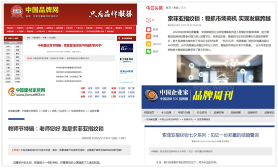 有了官網的助力,我們對索菲亞指紋鎖品牌的了解已有60%,但奮勇爭先的我們還得繼續往上“加分”。這時候我們可以通過在百度搜索品牌的相關新聞資訊,來看看媒體眼中的索菲亞指紋鎖又是怎樣的?逐一點擊新聞資訊,相信大家都發現了這些刊登索菲亞指紋鎖新聞報道的媒體權威度及知名度都頗高,如《中國建材家居網》、《今日頭條》、《搜狐網》、《中國品牌網》等媒體都擁有極高的傳播影響力及高覆蓋率。可見,能得到權威媒體認可、能受到讀者歡迎的索菲亞指紋鎖,早已積累了一定的口碑與美譽度。