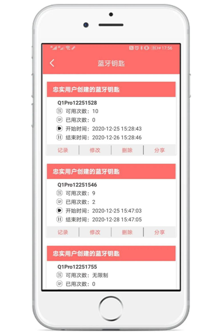 以保仕盾Q1Pro為例,經(jīng)銷商可以向客戶闡述電子藍(lán)牙鑰匙功能,該功能可以遠(yuǎn)程發(fā)送臨時(shí)密碼給朋友,朋友通過(guò)小程序就能快速開(kāi)鎖,分享人可以隨時(shí)查看、修改鑰匙信息,及移除鑰匙,非常方便。