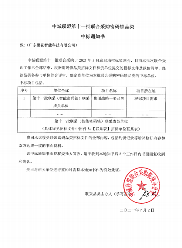 近日(7月2日), 經過嚴格的資格預審、單位考察、技術評審、商務談判等諸多環節,櫻花智能鎖憑借良好的品牌力、產品力與服務力,成功中標中城聯盟第十一批聯合采購,順利成為本次(智能密碼鎖)品類中標單位。