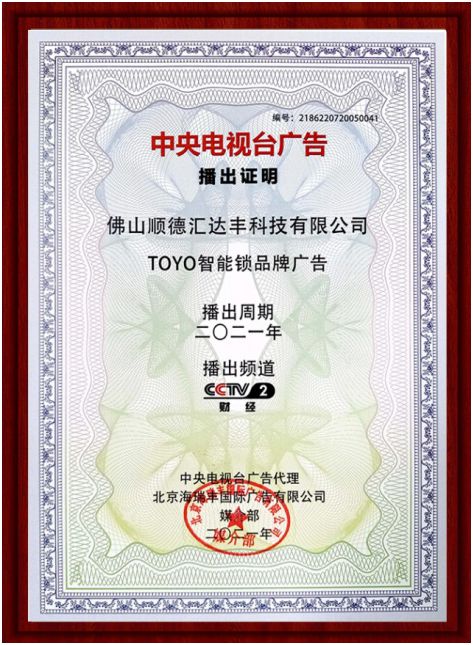 榮譽是企業獲得來自社會和公眾的獎項與贊許,是品牌口碑的重要表現形式,是可測量的品牌口碑指標。憑借多年的不斷努力和突破,TOYO智能鎖先后被授予“全球十大智能鎖品牌”、“CCTV廣告榮譽播出品牌”等榮譽稱號,旗下所有產品還通過了ABPC、MA、CNAS等聯合認證的質檢報告,享有世界公認“高質量、新技術”的美譽,受到全世界消費者認可。