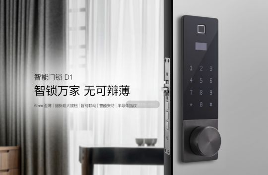 智能門鎖D1厚度僅有6mm,無按壓手柄設(shè)計(jì),指紋解鎖一按即開,大旋鈕的設(shè)計(jì)更顯大氣。