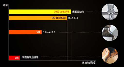 肉眼能看到花灑表面越光亮細(xì)膩,鍍層工藝處理得就越好。九牧花灑采用10級(jí)電鍍表層,外觀檢測(cè)達(dá)到A級(jí)標(biāo)準(zhǔn),外表面平整、光滑、線條流暢優(yōu)美。超強(qiáng)的抗腐蝕性,長(zhǎng)期使用保持產(chǎn)品外觀不生銹,歷久彌新。