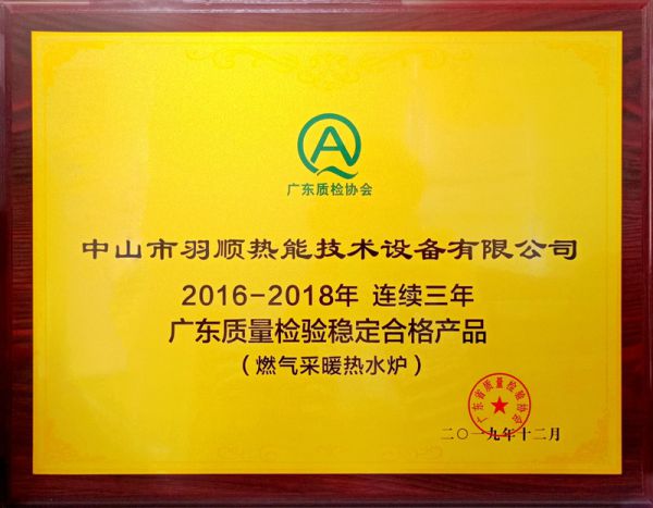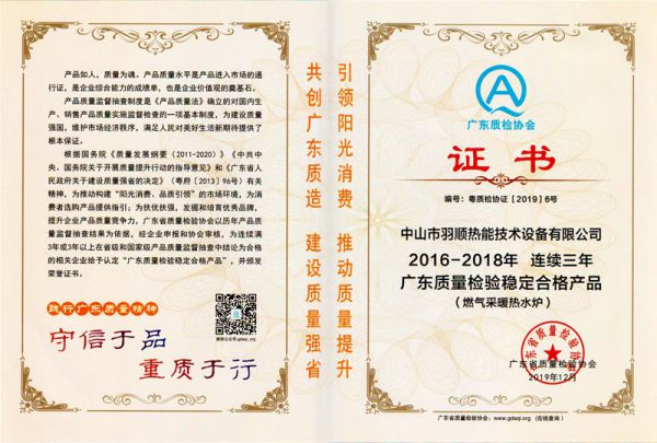 近日,中山市羽順熱能技術(shù)設(shè)備有限公司旗下羽順品牌燃?xì)獠膳療崴疇t,喜獲廣東省質(zhì)量檢驗(yàn)協(xié)會(huì)授予的《2016-2018年連續(xù)三年廣東質(zhì)量檢驗(yàn)穩(wěn)定合格產(chǎn)品》榮譽(yù)。