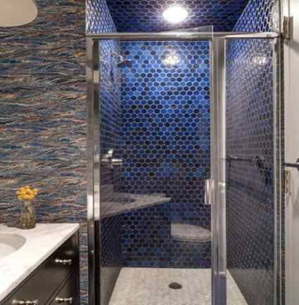淋浴房裝修效果圖一:混搭衛生間,藍色蜂窩狀的瓷磚和透明的淋浴房玻璃的搭配,給人一種視覺上的沖擊感,讓整個衛浴空間明亮簡潔。