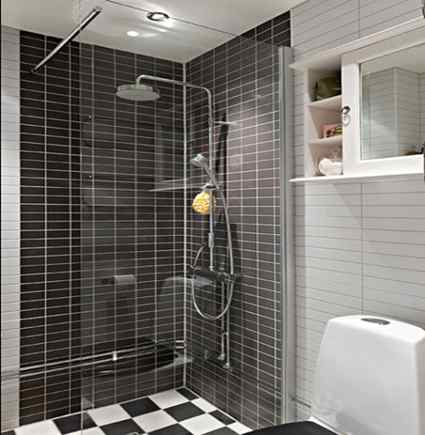 淋浴房裝修效果圖二:現代簡約衛生間,整體空間以黑白色為主色調,黑白格的方磚,墻磚黑白分離把整體風格的簡約化,展示的淋漓盡致。