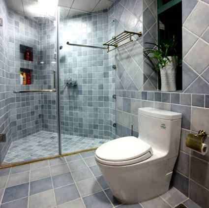 淋浴房裝修效果圖三:中式藍色衛生間,整個空間主色調運用藍灰色的地磚,盆栽的擺放讓整個空間多了些許生機,設計以簡潔的線條來構成于一體的中式整體空間格局。