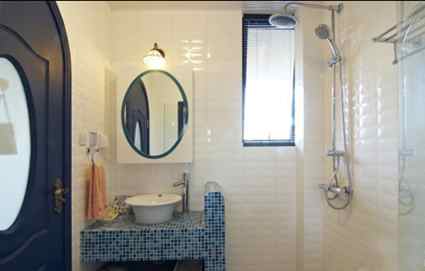 淋浴房裝修效果圖四:地中海白藍色衛生間,洗漱臺采用了地中海風格常見的馬賽克元素,與整體米白色墻面形成一個對比,整體空間沒有過多的裝飾品,讓空間看起來整潔大方。