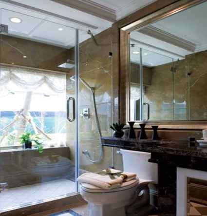 淋浴房裝修效果圖五:歐式咖啡衛生間,洗漱臺運用了歐式壁爐的造型,簡約的石膏線吊頂,卻沒有歐式那種繁多裝飾,造型比較簡單,整體空間以咖啡色為主,飾以淺色來進行整體配色,讓人看著舒適簡潔。