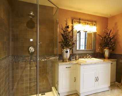 淋浴房裝修效果圖六:新古典黃色衛生間,整體以白色和古銅色調為主,洗漱臺的造型簡潔,臺上的花瓶給整個空間多添了些古典韻味,古銅色的墻面讓人浮躁的心,瞬間平靜的下來,營造了一種安靜氛圍。