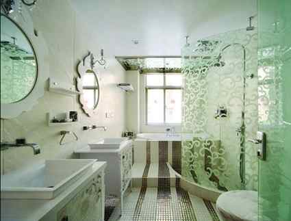 淋浴房裝修效果圖七:歐式綠色衛生間,整體空間以綠色為主色調,再配以黑白色,墻面運用歐式常見元素銅藝壁燈,又增加了現代元素鏡子的融合,空間給人一種自然清新的感覺。