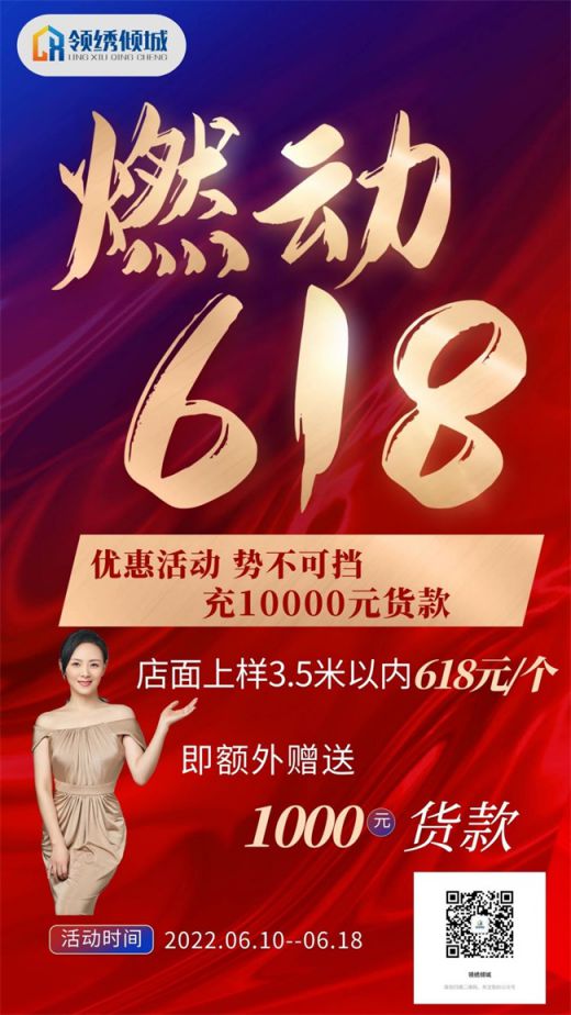 活動期間,領繡傾城軟裝推出鉅惠福利,消費者在店內充值10000元貨款,即可享受領繡傾城額外贈送的1000元貨款;與此同時,3.5米以內店面上樣僅需每個618元,優惠難得,還不快快前去選購!
