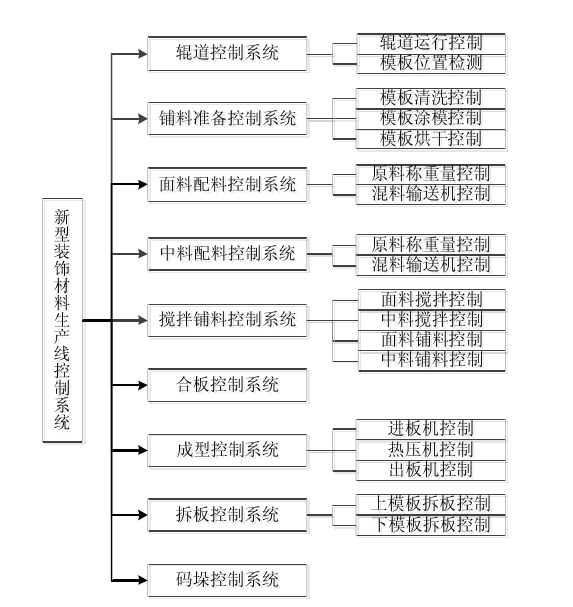 如圖所示,通過(guò)模塊化設(shè)計(jì)理念將新型裝飾材料生產(chǎn)線控制系統(tǒng)劃分為:輥道控制系統(tǒng)、鋪料準(zhǔn)備控制系統(tǒng)、面料配料控制系統(tǒng)、中料配料控制系統(tǒng)、攪拌鋪料控制系統(tǒng)、合板控制系統(tǒng)、成型控制系統(tǒng)、拆板控制系統(tǒng)、碼垛控制系統(tǒng)等模塊。各模塊控制系統(tǒng)的具體作用與實(shí)現(xiàn)內(nèi)容如下: