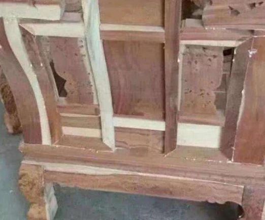 這類(lèi)廠商把白皮著色和描畫(huà)花紋等多道“化妝”工藝,就變成正所謂的紅木家具。這類(lèi)家具不但內(nèi)部和隱秘處藏著大量白皮,有的表面層都坦露著白皮,不但用紅酸枝這一種紅木家具帶有白皮,就連用大葉紫檀、小葉紫檀和黃花梨這類(lèi)更為名貴的紅木制成的家具也都帶有白皮。