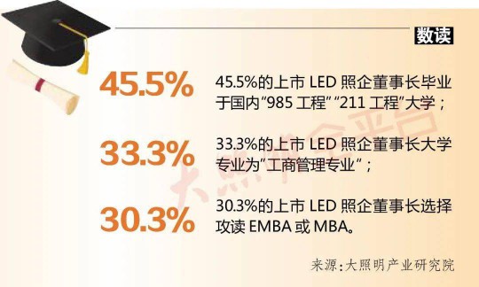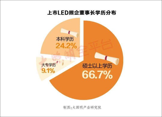 據大照明產業研究院統計,33家 上市LED照企中,擁有博士學位的董事長有5位,碩士學位的董事長有17位(其中,EMBA有7位、MBA有3位),碩士以上學歷的董事長占比達到66.7%。此外,本科學歷的董事長占比24.2%,大專學歷的董事長占比9.1%。