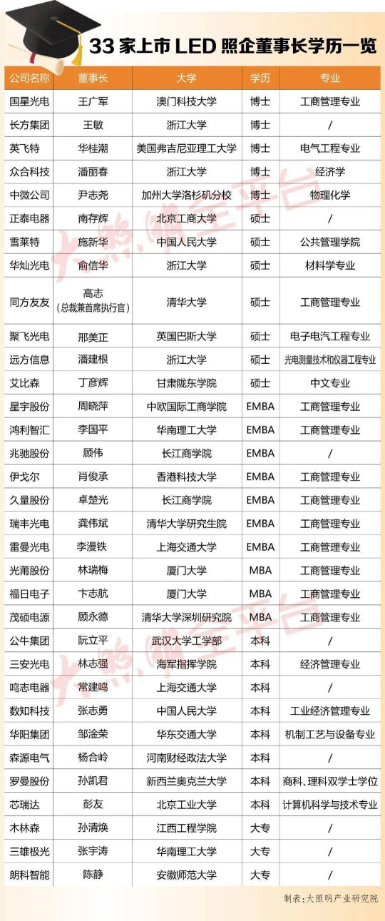 從統計結果來看,33位上市LED照企董事長多數畢業于國內著名高校,如畢業于清華大學的高志、畢業于中國人民大學的施新華,可謂是“學霸云集”。盡管業內一直有著“照明行業進入門檻低”的論調,但事實上,每個行業都認“高學歷”,LED上市照企更是如此。為此,“讀書無用”之論可休矣。