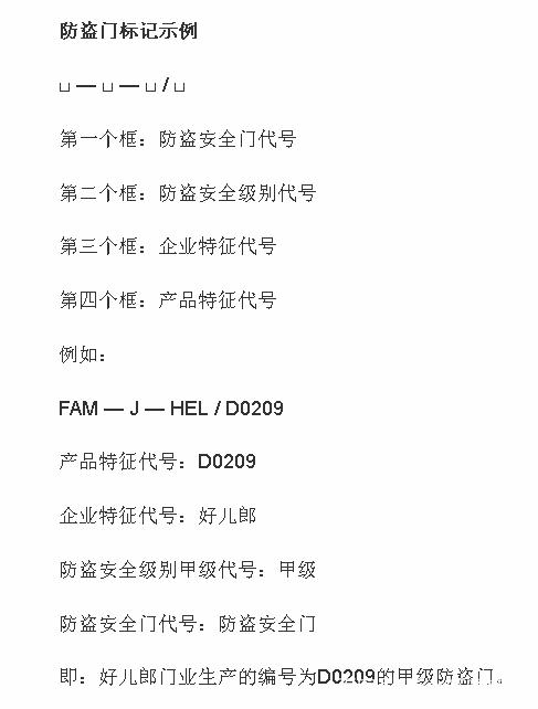 接下來小編要教大家如何挑選一款適合自己的,先來了解一下門上的標記是什么意思。由三個部分組成:標記符號為拼音字母,從左到右分別為防盜安全門代號(FAM)、防盜安全級別和企業自定義特征(包括企業代號和產品代號兩部分)。其中,防盜安全級別標記永久固定在內側鉸鏈邊上角,距地面高度為1600mm±100mm的位置上 。