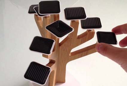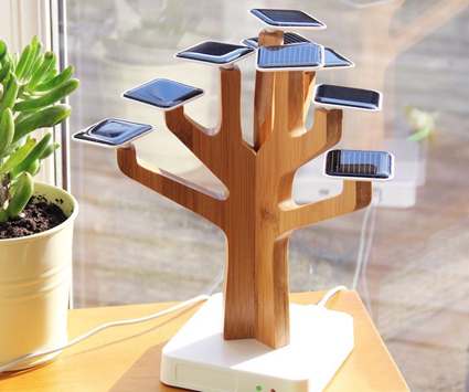 這款新式太陽(yáng)能充電器的外觀設(shè)計(jì)十分有趣,采用了樹(shù)木的造型。在木質(zhì)的樹(shù)干上,帶有很多太陽(yáng)能電池板,數(shù)量達(dá)到9個(gè)之多。在底座上,為內(nèi)置電池盒,白色的風(fēng)格十分優(yōu)雅。在電池盒上,帶有綠色和紅色指示燈,可以了解到內(nèi)置電池充電的情況。