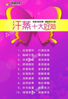 汗蒸館多是以納米、遠(yuǎn)紅外線、電氣石能量磚等為特色,通過(guò)加熱后釋放負(fù)離子、亞離子、遠(yuǎn)紅外線、礦物元素,代謝皮膚中的有害物質(zhì),提高肌膚彈性,達(dá)到美容減肥、延緩衰老的功效。而冬季汗蒸的保健作用更為明顯,因?yàn)槎竞洌旧砩眢w出汗少,人體毒素難以通過(guò)汗液排出,而汗蒸則可促進(jìn)排汗、加快體內(nèi)的新陳代謝、加速體內(nèi)血液循環(huán)、打開(kāi)毛孔、打通身體內(nèi)環(huán)境,促進(jìn)健康,還可排除毒素、降脂減肥,除此之外,還可緩解關(guān)節(jié)疼痛、腸胃病等癥狀,因而可以說(shuō)冬季是最適合做汗蒸的季節(jié),也是最需要做汗蒸的季節(jié)。