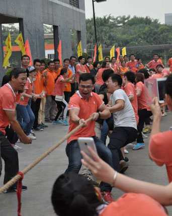 運動場上,最矚目的要數參與度最高的拔河比賽。參賽隊隊員們個個摩拳擦掌,躍躍欲試。隨著一聲哨響,拔河比賽正式開始,比賽中參賽隊員雙手緊握長繩,大家都鉚足了勁兒、全力拼博,隨著長繩子上紅色錘線的左右移動,場外加油聲、吶喊聲、口號聲、歡呼聲連成一片,場面頗為壯觀。