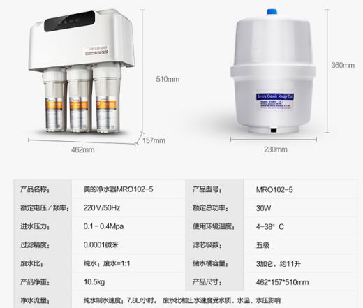 這里我們要一個個重要的參數。純水與廢水比:1比1,比市面上80%的純水機制水率都要高。所以美的凈水器mro102-5也被消費者貫以美的節水大師的稱號