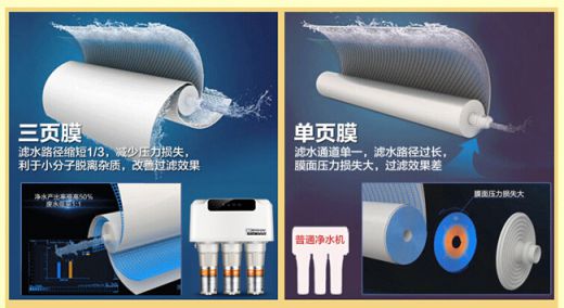 美的三頁卷膜技術是美的凈水機最新的創新技術,通過多張RO膜降低水在膜葉中行走的路程,同時提升凈水水質,用戶不僅能喝到更健康的水,而且還降低了用水損耗,創造出1∶1的行業最低廢水標準 ,符合既健康又節水的凈水需求。更重要的是,多膜協同凈水,把單一RO膜使用壽命延長至3年,用戶可長久享受健康飲水生活。
