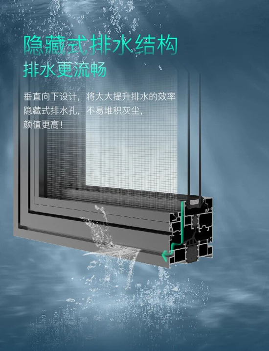 Delta95內開窗采用隱藏式排水結構,垂直向下的設計大大提升了排水效率,雨水能夠迅速排出室外,不易堆積灰塵和雜物,避免了排水不暢導致的雨水倒灌問題。