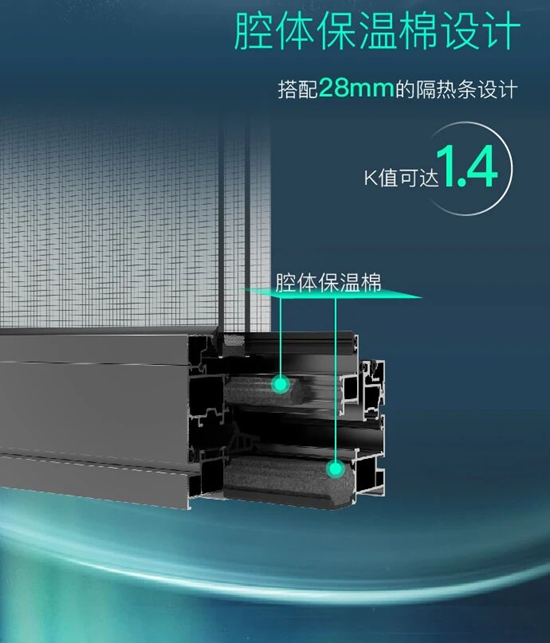 Delta95內開窗采用復合多腔體結構設計,搭配28mm的隔熱條和腔體保溫棉設計,K值可達1.4,具有出色的隔熱保溫性能。
