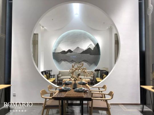 新中式空間采用中國古典園林設計風格,同時運用園林建筑中常用的借景設計手法。遠處的山峰背景墻通過水刀切割拼接設計而成,至尊石材系列至尊寶格麗、昆士蘭砂巖化作連綿巍峨、高聳入云的山峰,白色細膩的紋理如同高山流水,至尊爵士白化作潔白無瑕的白云漂浮在天空中,構成一幅壯麗山河圖,展現大自然的宏偉壯闊、鬼斧神工。