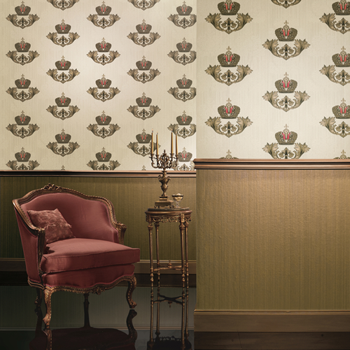 我的壁紙理想型是德國瑪堡壁紙中《王者之風IV》系列,它更適合安靜肅穆的紳士書房氛圍。壁紙圖案中暗酒紅色皇冠內飾與扶手書椅面料巧妙呼應,墻面下半部以實木腰線分割開來,搭配深金咖色素色墻紙。