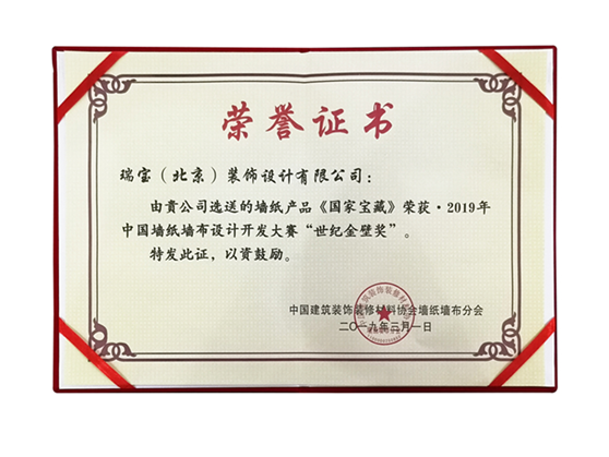 這一次,瑞寶軟裝設計團隊原創的壁紙產品《國家寶藏》可以在2019年中國壁紙墻面覆蓋設計與開發大賽中獲得“世紀金壁獎”的榮譽,這不僅是產品質量和技術創新的體現,也是品牌實力的進一步證明。
