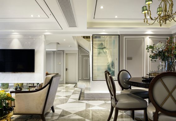 客廳往往意味著著房子的門臉,這里一般是主人招待賓客的地點。客廳一般宜用淺色,讓賓客有眼前一亮的感覺,使來賓消去一天奔波的疲憊。背景墻選取純白色的磚藝愛覺藝術涂料品牌干凈利落,底下的柜子采取了溫和的木材質,和白色搭配一起,簡潔明快。