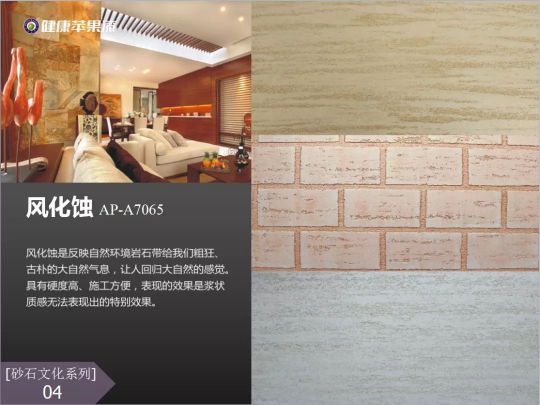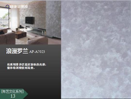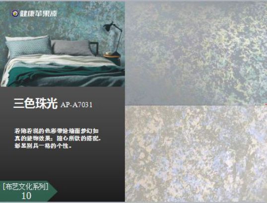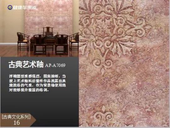 健康蘋果文化藝術涂料分為四個系列:而每個系列,因為色彩和表現手法的不同,又可以延伸出多種藝術效果,每個系列都有不同的表現手法。