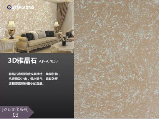 適用范圍:綠色環保,可塑性高,可使墻面展現立體效果,紋理清晰,酷似壁紙,抗霉抗菌,吸音減噪,適于室內墻體,天花和石膏板等。