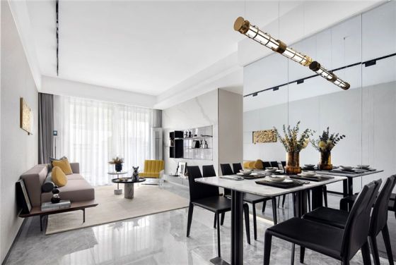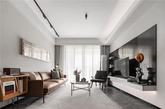 設(shè)計以低調(diào)的黑白灰呈現(xiàn)現(xiàn)代簡約之美,棕色打破沉悶節(jié)奏,提升空間質(zhì)感。硬朗的金屬、玻璃材質(zhì)凝練精致品味,上好的意式皮革及布藝則營造了柔軟舒適的居住氛圍。