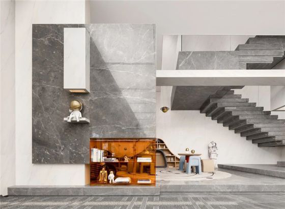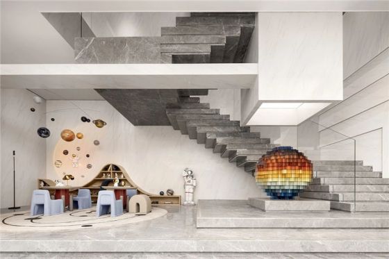 通往二層樓梯采用沉穩(wěn)的灰色大理石紋路設(shè)計,與墻飾形成空間上的呼應(yīng),灰白色系由淺至深,引人入勝。在此襯托下,由太陽系八大行星概念組成的裝飾球體,為低飽和度的空間注入一抹鮮色,成為點睛之筆。
