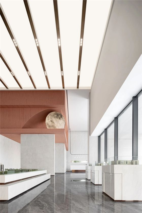 進入大廳,映入眼簾就是碩大的月亮鑲嵌在半空中,正如地球與月球之間的引力關(guān)系,輝映著整個空間的各個區(qū)域。