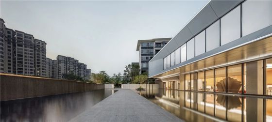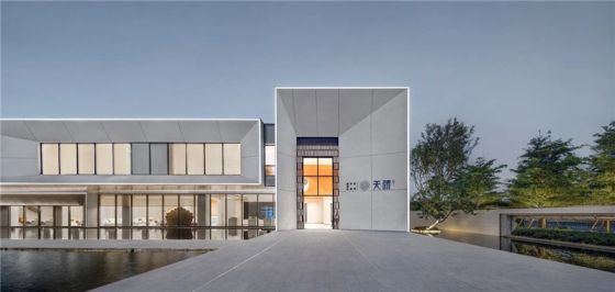 售樓部以當(dāng)代美學(xué)的解構(gòu)重組藝術(shù)形態(tài),與湖水形成的倒影,像極了一艘宇宙飛船橫臥于此。走進售樓部,就如同登“船”一樣,踏上探索浩瀚星空的征途。