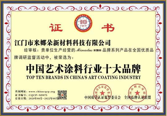 目前的涂料市場上,品牌琳瑯滿目,不斷的在擴大的消費市場。但是能夠很好的進行銷售的產品,還是需要看品牌,看產品的品質是否符合和滿足消費者實際需求,米娜朵藝術漆就很好的把握住了這一點,獲得了“中國藝術涂料行業十大品牌”榮譽。