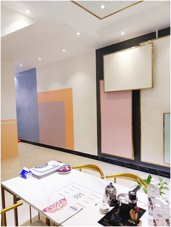 踏入泰詩爾防城港體驗店內,你可以體驗并選擇自己喜歡的裝修風格,觸摸富有質感的墻面。泰詩爾肌理壁膜既有墻布的效果和手感,又可以防水防潮,還有極強的耐擦洗性能,更關鍵是環保凈味,達到法國A+認證以及榮獲中國綠色環保產品,實用更放心。店內走廊區域運用幾何色塊的搭配,將場景空間與色彩巧妙結合,讓原本平靜的畫面跳躍起來,棱角分明的幾個色塊更增加了視覺沖擊力,演繹不一樣的家居藝術趣味。