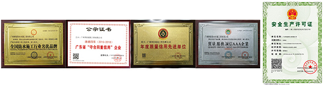 我司擁有國家級防水防腐保溫工程專業(yè)承包貳級資質(zhì)、連續(xù)五年被評為廣東省守合同重信用企業(yè)、年度質(zhì)量信用先進單位、質(zhì)量.服務.誠信AAA企業(yè)、全國防水施工行業(yè)名優(yōu)品牌、廣東省建筑防水材料協(xié)會會員、廣東省產(chǎn)品促進會副會長單位。我司在廣州房屋維修專業(yè)施工行業(yè)知名品牌企業(yè)排名前伍位。
