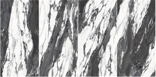 黑與白,動與靜,在這一片方正大板上揮灑出不拘一格的美感,白是凝固、是靜默、是深沉、是素以為絢的從容不爭;黑是流動、是氤氳、是揮毫潑墨的豪邁灑脫。色相相投,紋理交錯,層次鮮明,“一石四版”的分割設計,則讓每一片各不相同,彰顯獨特氣韻。
