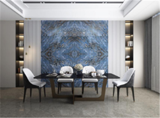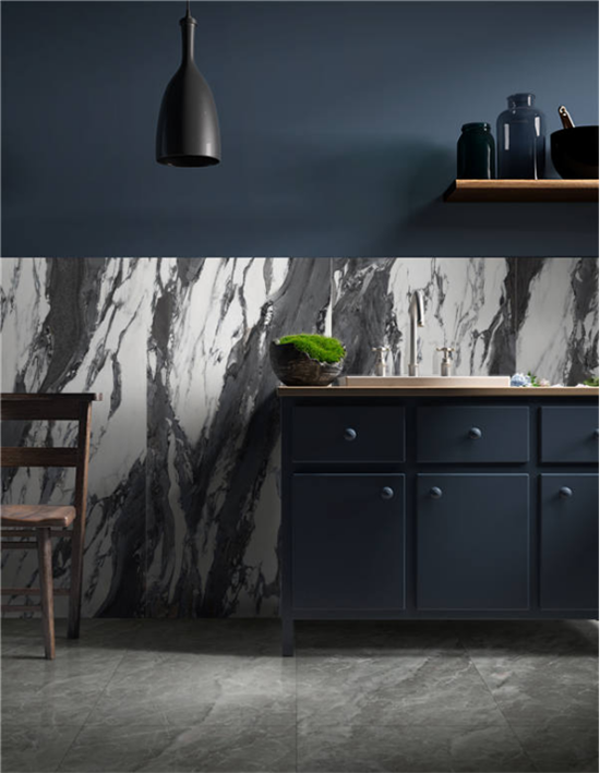 這款星空也承襲這樣的特色。濃烈明艷的色彩,普魯士藍的底版深沉蘊藉,古銅色脈絡如絲如縷嵌入其中;原畫厚涂的筆觸,層次豐富,動感十足,生動地描繪了充滿運動和變化的星空。藝術性的紋理搭配750x1500mm的黃金規格,從質感到規格,從工藝到紋理,都在挑逗人們的視線,極具吸引力。