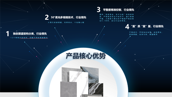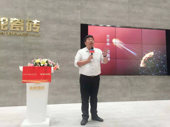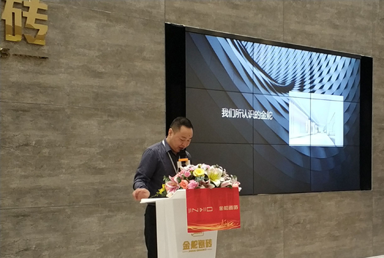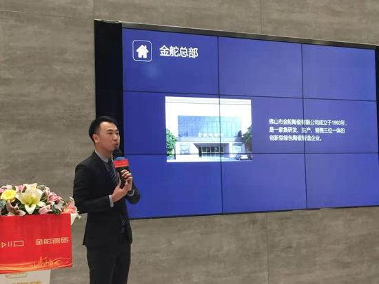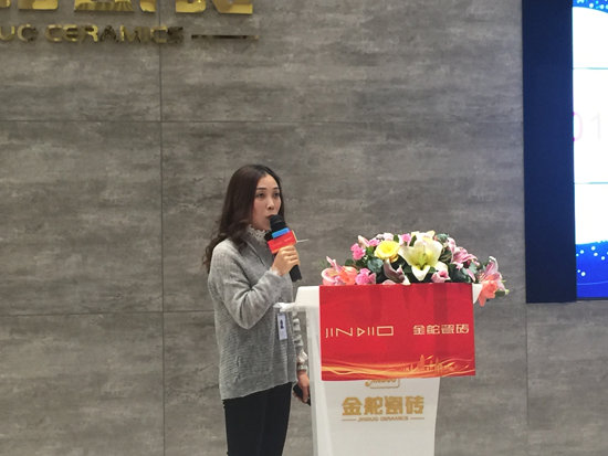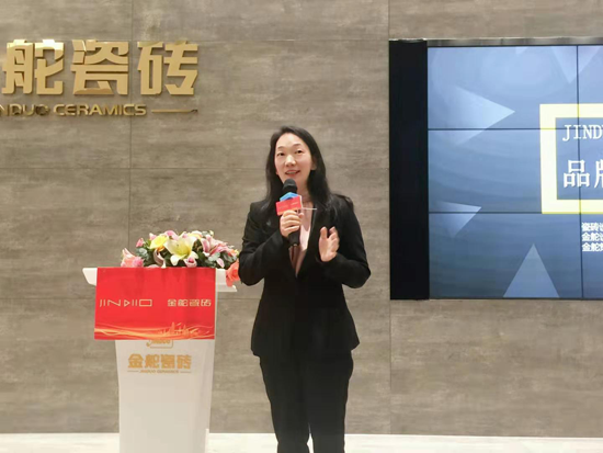 【10:58】產品研發管理部經理潘玉霞女士講解金舵產品。金舵瓷磚以終端市場為導向,面向用戶需求,不斷探索工藝,堅持自主研發創新,開發符合市場潮流的產品花色,完善產品結構。為提升產品的市場競爭力,歷經產品調整轉型、品牌升級等多方面舉措,推廣核心產品、建設標準店面,繼續踐行設計營銷理念。