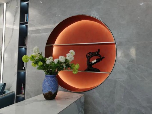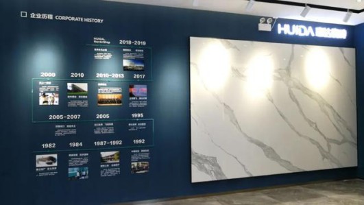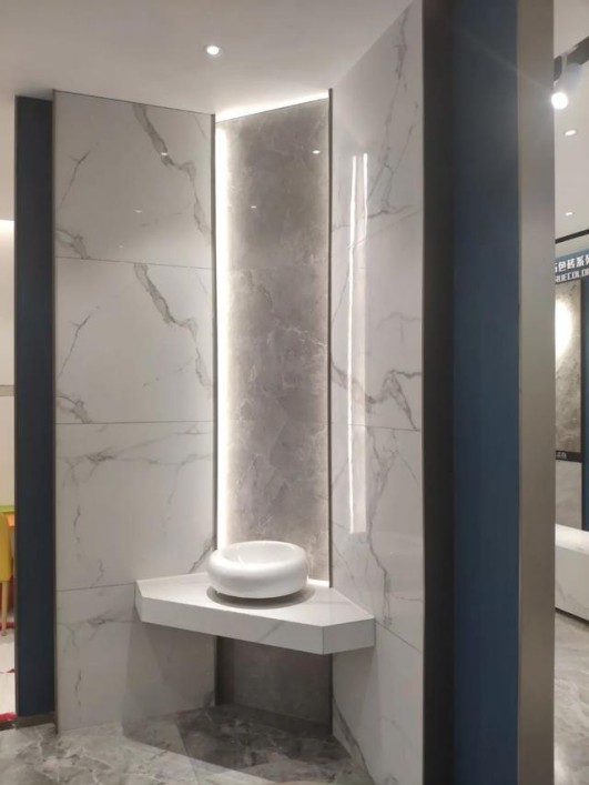 步入展廳,1200*2400mm規(guī)格任意連紋巖板背景墻,渾然天成的紋理盡顯磅礴大氣風(fēng)范,3片不同紋理版面完美銜接,與惠達(dá)LOGO互相呼應(yīng),盡顯高級與大氣。側(cè)面靜謐的經(jīng)典藍(lán)墻吸睛,展示著惠達(dá)瓷磚的榮譽(yù)證書,增強(qiáng)消費(fèi)者對品牌的信任感。