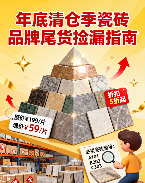 歲末將至,瓷磚市場迎來年度最后一波“抄底”盛宴——品牌尾貨清倉季正式開啟。在消費降級與品質升級并行的時代背景下,瓷磚尾貨不再是“殘次品”的代名詞,反而成為精明業主“花小錢辦大事”的黃金機遇。2025年,隨著環保新規全面落地、智能家居加速滲透、國潮設計持續破圈,本輪清倉季更暗藏三大趨勢密碼:環保認證成硬指標、智能瓷磚成新寵、國潮紋樣成爆款。如何在這場“瓷磚界的雙十一”中精準撿漏?本指南將從價值重構、選品邏輯、熱點融合三個維度拆解實戰攻略。