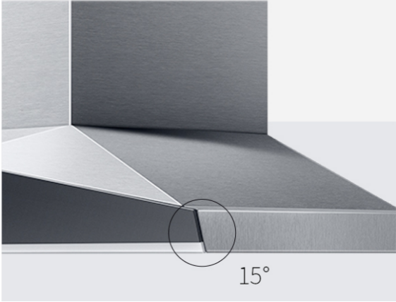 (老板油煙機8231GS創新15°煙機下側黃金切角設計,防撞頭好視角)