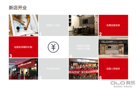 6步助經銷商快速開店,包含完全免費設計方案、完全免費店面安裝、店面各類福利補貼、店面工程驗收快速投放運營還有開業活動支撐、店面人員管理。利用這6步幫扶支撐,我樂家居幫助進入我樂全屋定制經銷商讓店鋪快速走上正軌。
