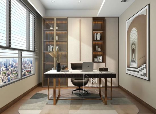 書房以玻璃柜和木門柜組合而成,玻璃柜通透奢雅適合存放藏品,凹型封閉柜可存放書籍文件,搭配簡約掛畫營造舒適簡約的辦公氛圍。