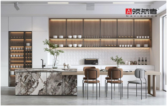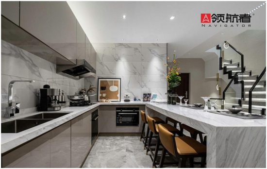 所以領航者采用了“隱藏式設計”,把雜亂、不常用到的東西全部收藏起來,減少臺面上用品的擺放,消除視覺上的雜亂感。廚柜加倒臺的設計,也便于家人之間的互動,更是設計美學的藝術。